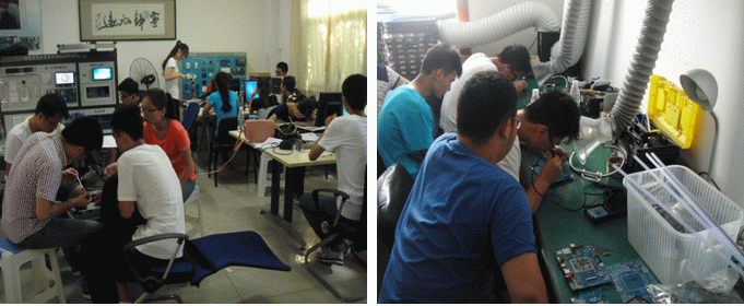 焊接部负责传感器节点、网关等电子器件的焊接与测试。这里不需要先进的技术,不需要繁杂的数据文档,练就的娴熟技艺就可独挡一面。比米粒1/4还小的电容电阻,贴片芯片,多脚芯片,还有从未见过的各种元件,都让我们感到新奇又无从下手。通过工作人员的指导,多次的练习,掌握了技巧,渐渐熟练了起来。焊接室的工作虽不复杂,但有一定危险性,工作人员时时提醒我们要注意安全,谨防烫伤,工作时一定要打开吸风筒,以免吸入过多毒气。几天的时间,我们不仅熟练了焊接技艺,还学会了滑焊和拆卸修理板子的技巧。