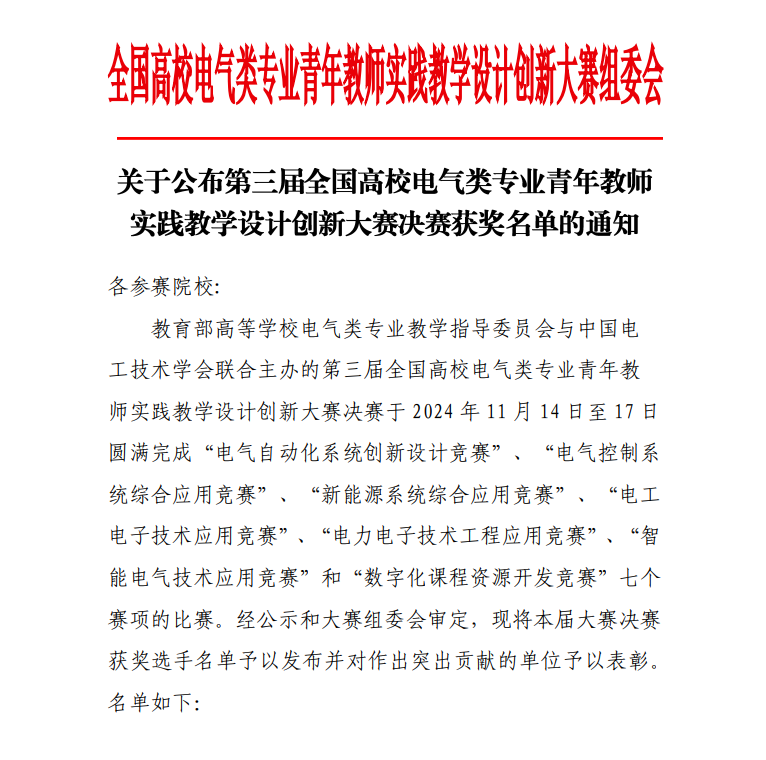 11月14-17日,第三届全国高校电气类专业青年教师实践教学设计创新大赛决赛在徐州工程学院成功举办。自动化学院青年教师郭鑫、程刚在“电气自动化系统创新设计竞赛”赛项中,凭借作品“智能电气综合实践平台开发与面向工程应用教学案例设计”获得“电气自动化系统创新设计竞赛”赛道全国二等奖。