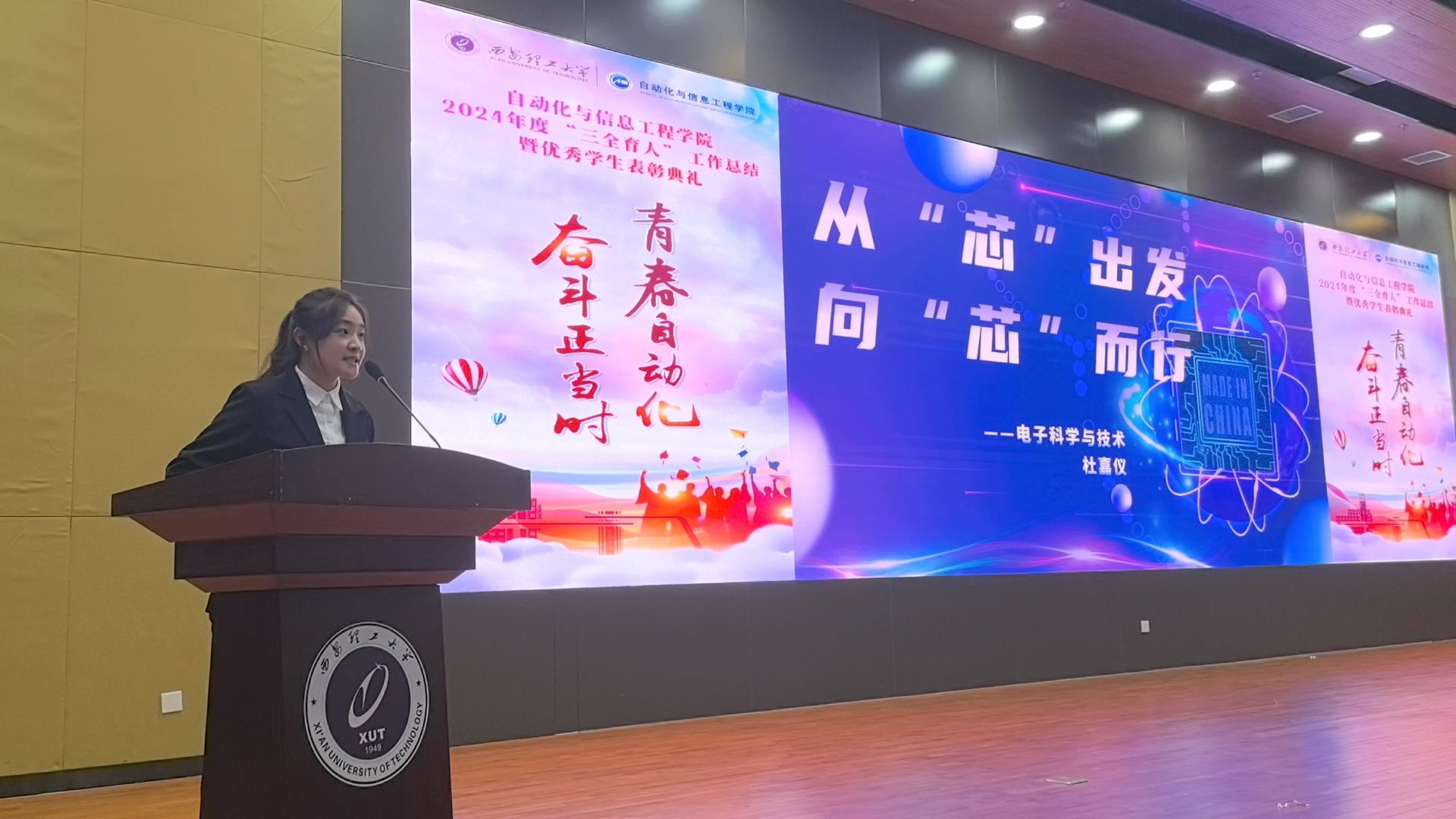 勇攀高峰、敢为人先。2021级本科生,自动化科协部长团成员杜嘉仪同学为大家讲述了“龙芯”之母——黄令仪向着芯片科技研发奋勇前行的故事。从“芯”出发的道路上,科学家精神在学院传承。披朝暮、携光明,他们夜以继日,集智攻关,精研专业技术。创新是他们的旗帜,探索是他们的热忱追求。