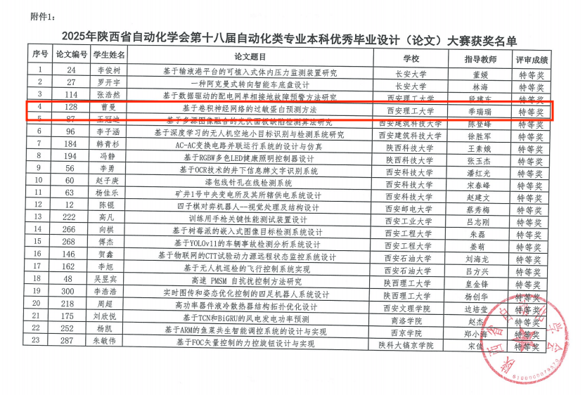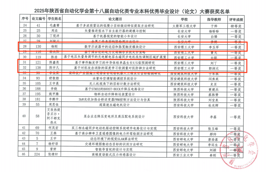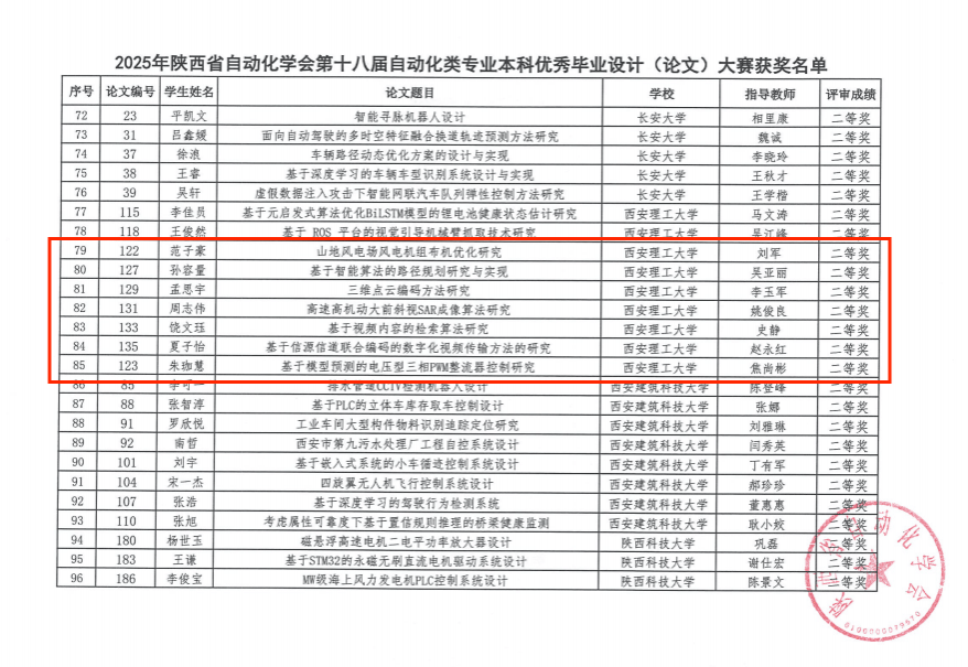 近日,陕西省自动化学会发布了《关于公布2025年陕西省自动化学会第十八届自动化类专业本科优秀毕业设计(论文)大赛评选结果的通知》,此次大赛由陕西省自动化学会教育及普及委员会主办,陕西理工大学承办。