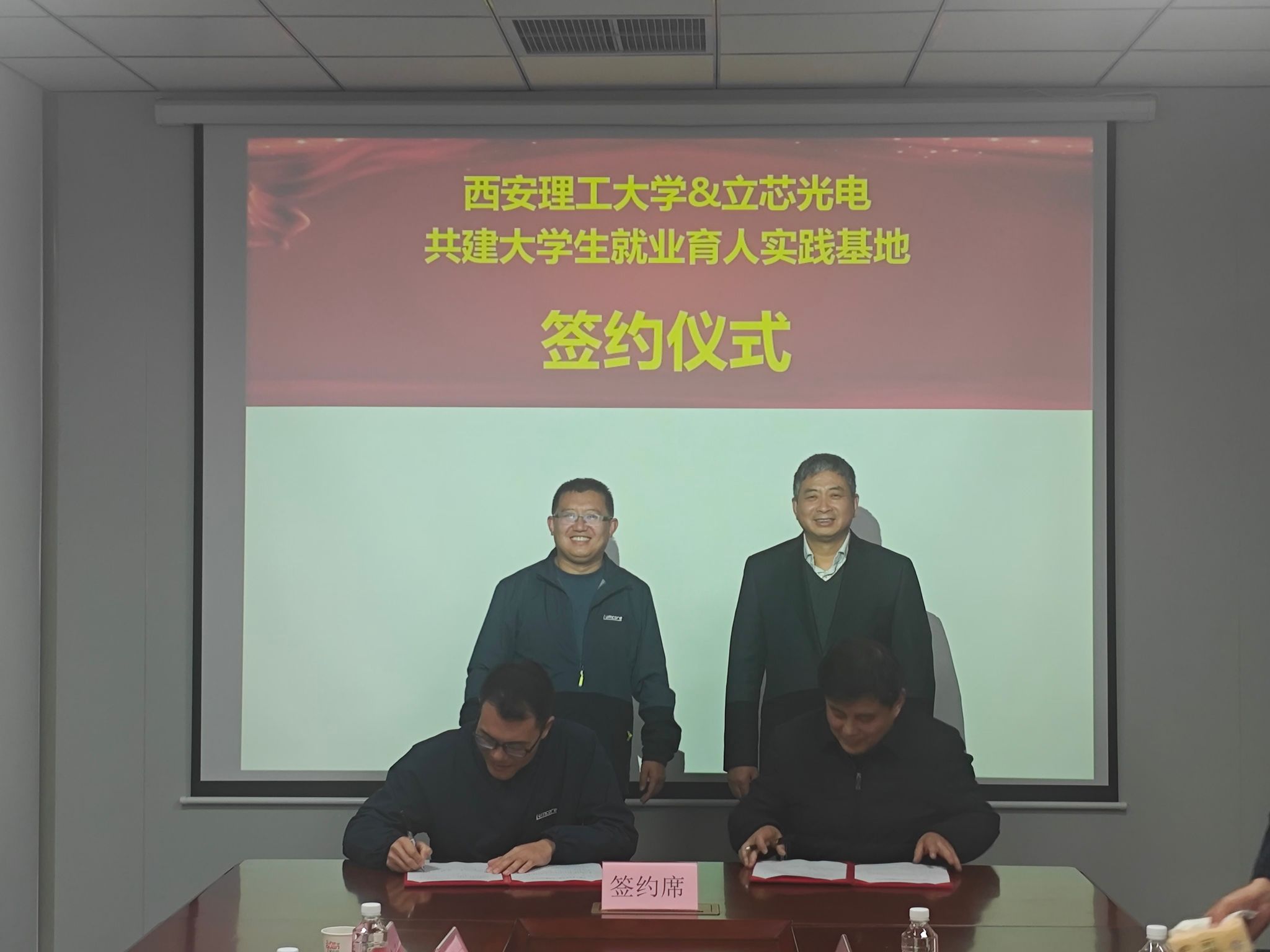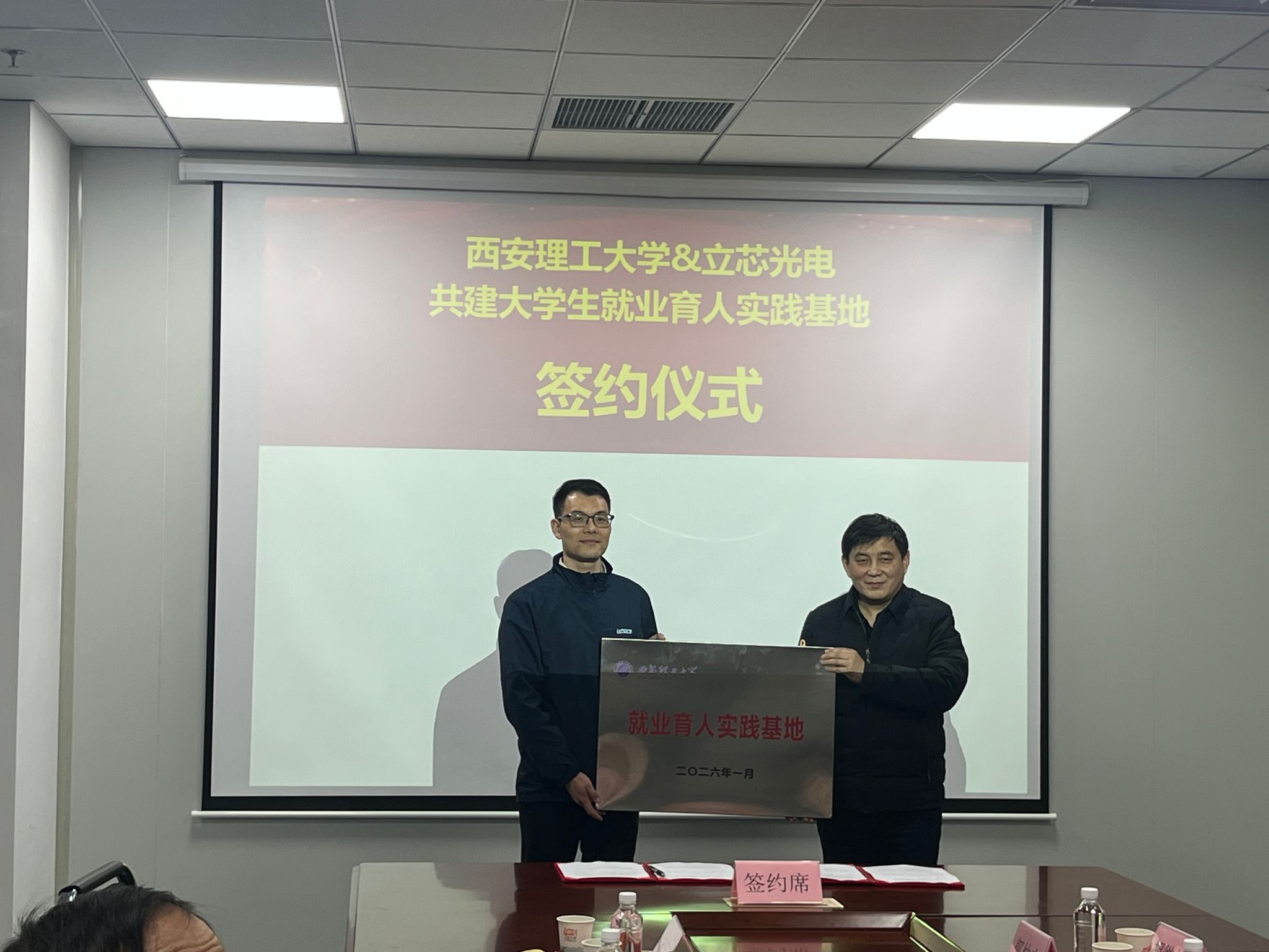 122cc太阳成集团自动化公司党委书记彰伟与西安立芯光电科技有限公司总经理李青民代表双方签署《共建老员工就业育人实践基地协议书》并授牌。