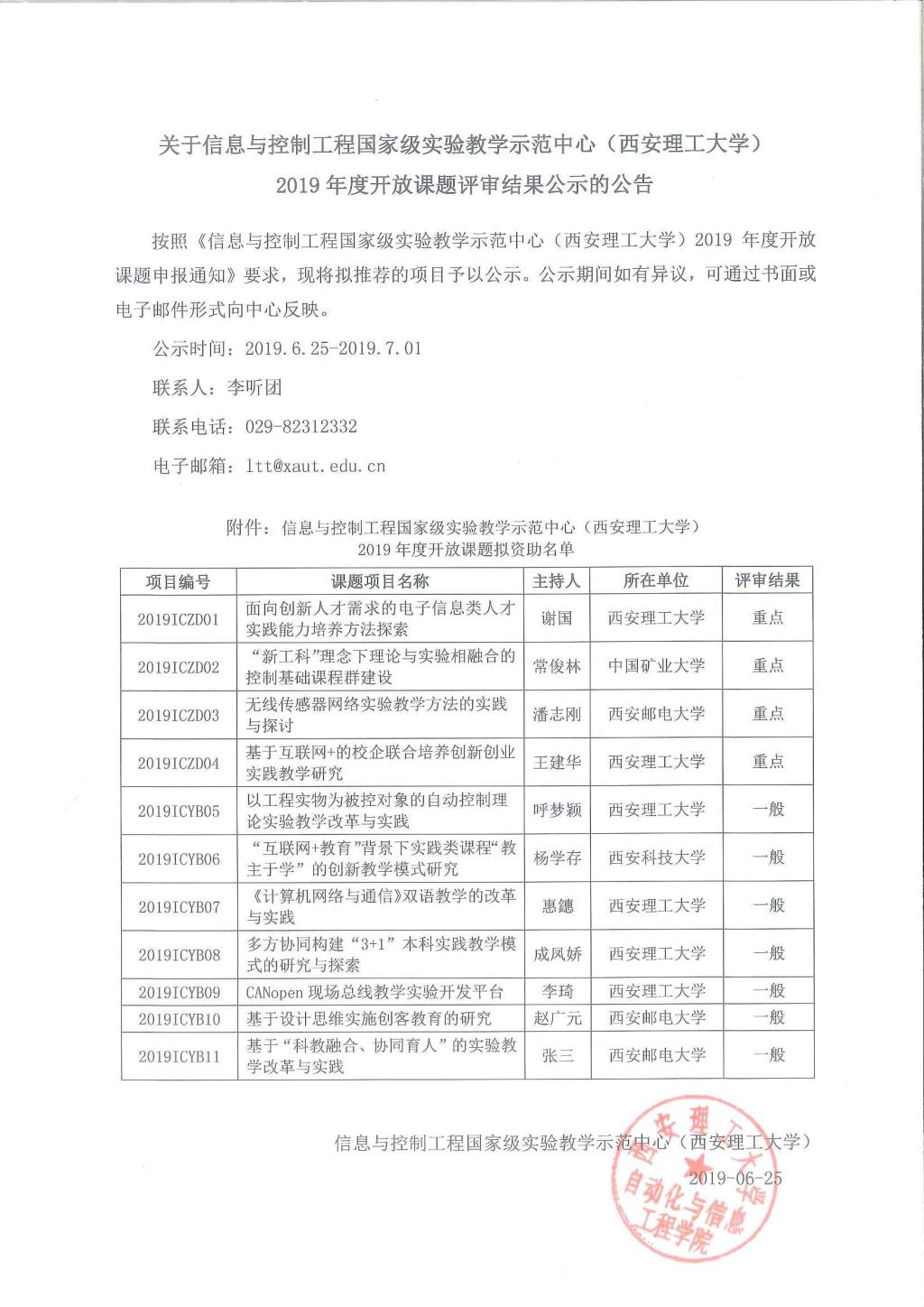 关于信息与控制工程国家级实验教学示范中心(122cc太阳成集团)2019年度开放课题评审结果公示的公告