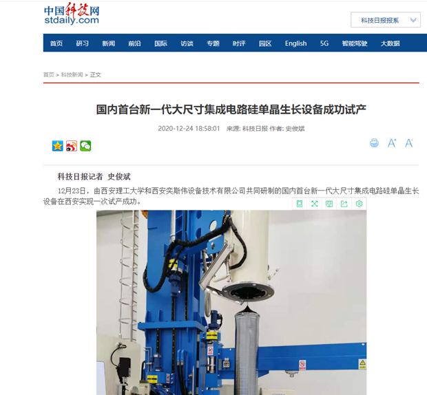 工程研究中心基于前期发明并制造,与国内知名半导体生产企业(西安奕斯伟材料科技有限公司)合作开展产学研工作。2020年12月23日,由中心主任刘丁教授团队研制的新一代大尺寸集成电路硅单晶生长设备在西安奕斯伟大硅片生产基地产线实现一次试产成功。为实现我国在集成电路硅材料关键技术与核心工艺产业化方面取得新突破、解决在半导体大硅片领域的“卡脖子”问题做出了重要贡献。